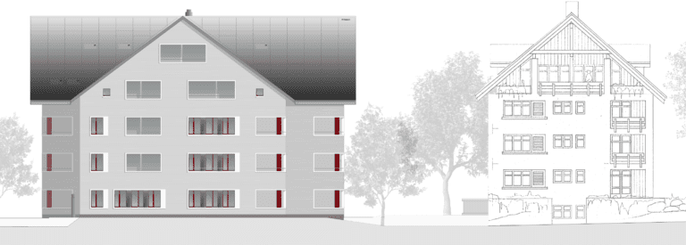 Die Fassade in hellgrauem Farbton gehalten, mit kontrastreichen, dunkelroten Fenstern und weissen Gewänden umrahmt, widerspiegelt die Elemente der Kernzonenoptik modern interpretiert. In diesem Sinne konnte ich die Frage des Eigentümers mit gutem Gefühl mit Ja beantworten: Es ist an dieser Adresse möglich, etwas Stilvolles, das sich in den Dorfkern integriert, zu bauen.
